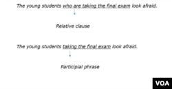 We are going to leave you with some homework. Can you change these sentences with relative clauses to sentences with participial phrases? Write to us in the Comments Section of our website or on our Facebook page.