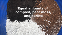 Step 2. Mix equal parts of peat moss, compost and perlite or vermiculite together with a small amount of wood ash if you have it. If you are using sand, do not use as much because sand is heavy.