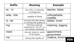 Some common suffixes are -er, -s, -es, -ed, -ing and -ly.