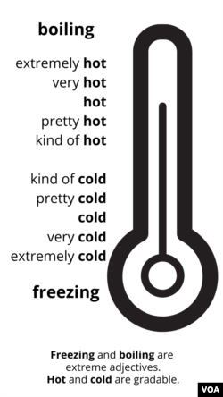 You probably noticed that I used the word “very” repeatedly in my story. I did it to demonstrate this point: Rather than repeat an intensifier too often, we can usually choose stronger adjectives. We call the strongest adjectives non-gradable, or extreme, adjectives.